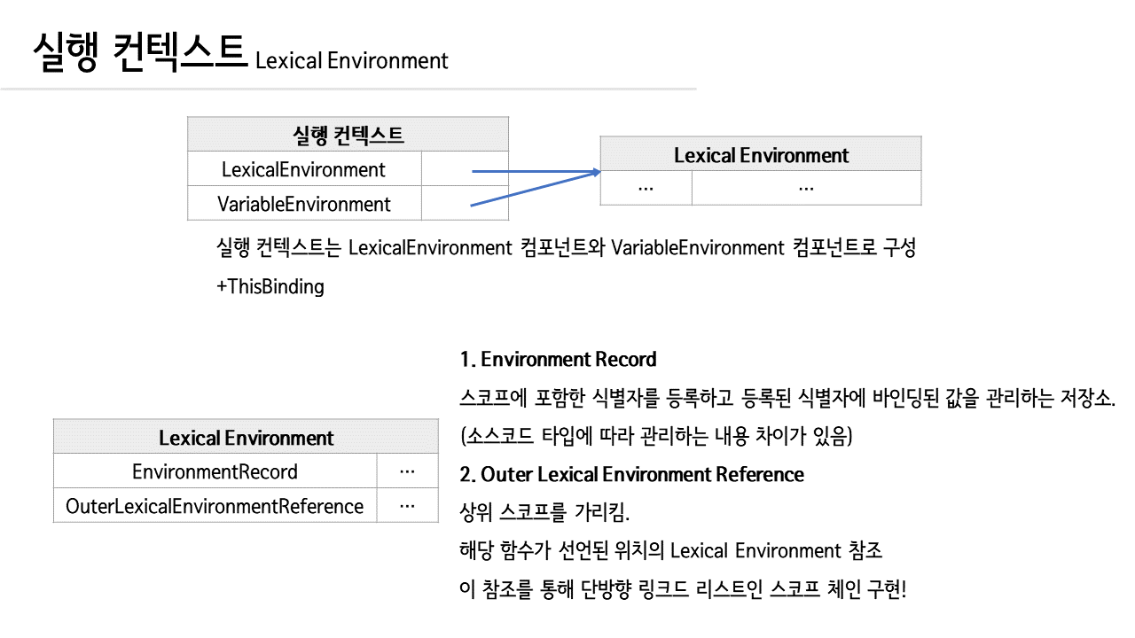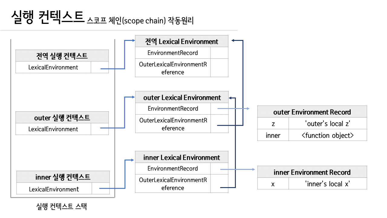 outerEnvironmentReference는 상위 스코프의 LexicalEnvironment를 가리키고, 이를 통해 스코프 체인이 구현되어 있습니다.