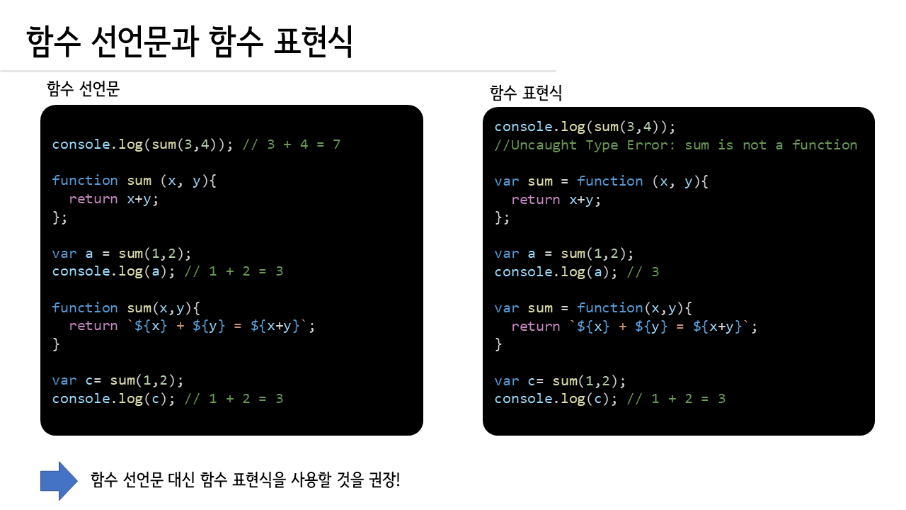 함수선언문이 함수전체를 호이스팅에서 의도치 않은 결과를 나타낼 수 있기 때문에 가능한 함수표현식만 쓰는 것이 안전합니다.