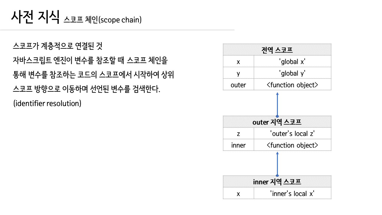 스코프체인은 실행컨텍스트의 lexicalEnvironment의 outerEnvironmentReference로 구현되어 있습니다. 단방향 링크드 리스트의 형태로, 가장 가까운 요소부터 순서대로 접근할 수 있습니다. 따라서 동일한 식별자가 있다면, 가장 먼저 발견된 식별자에만 접근할 수 있고, 이보다 상위의 식별자에는 접근할 수 없습니다. 이런 것을 변수 은닉이라고 합니다. 또한 단방향 링크드 리스트이기 때문에 상위 스코프에서 하위 스코프의 식별자에 접근하는 것은 불가능합니다.